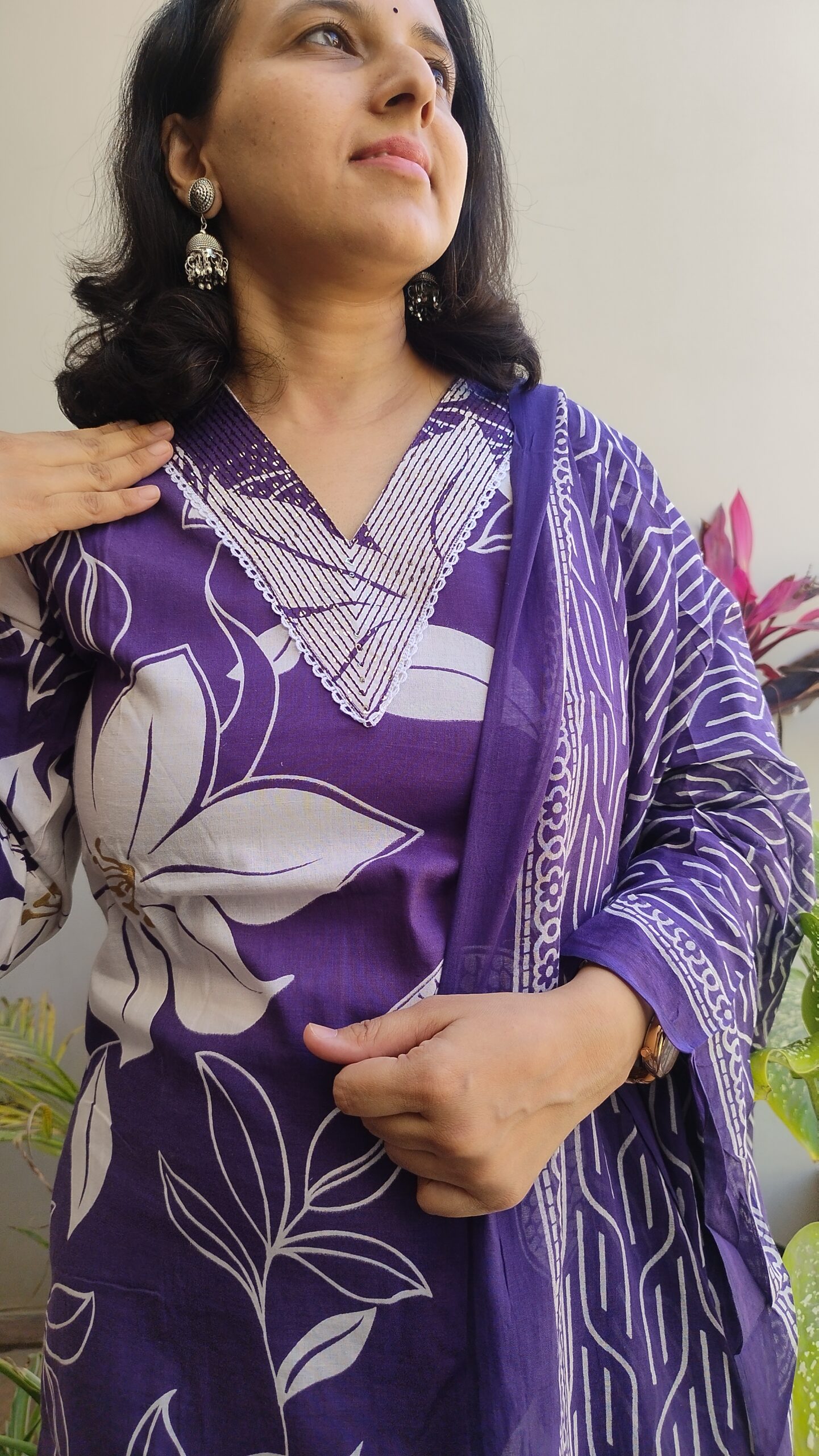 A beautiful combination made with 100% cotton fabric. It comes with dupatta and pants. It is perfect fit for regular wear or office wear . It has beautiful handwork on neck.