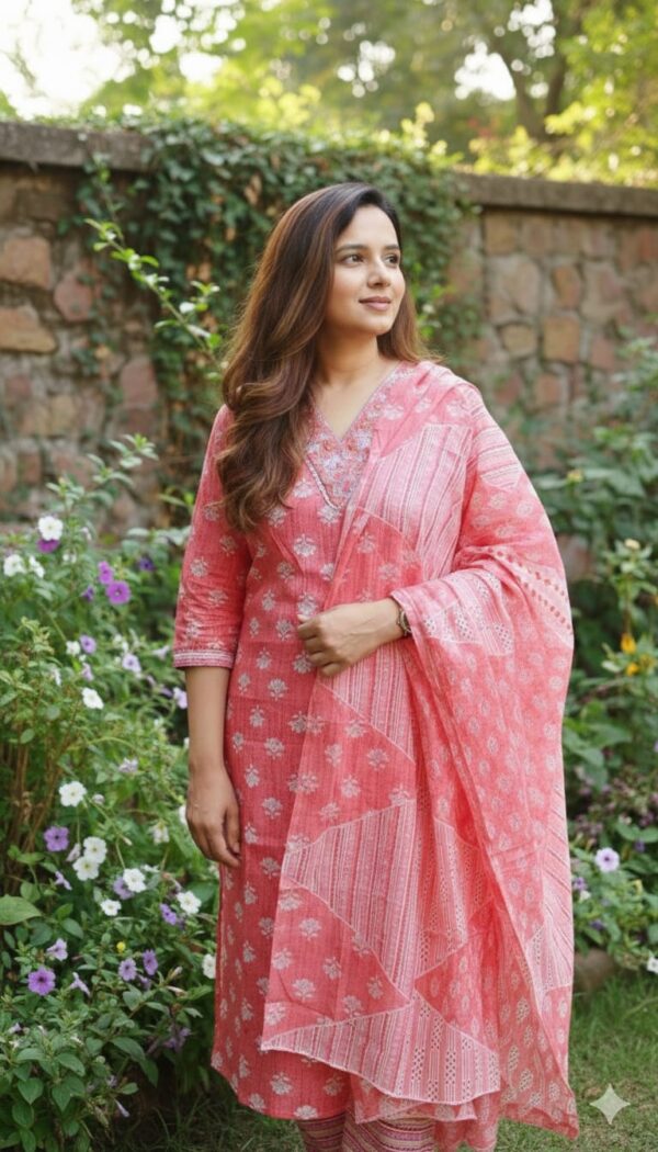 A beautiful combination made with 100% cotton fabric. It comes with dupatta and pants. It is perfect fit for regular wear or office wear .