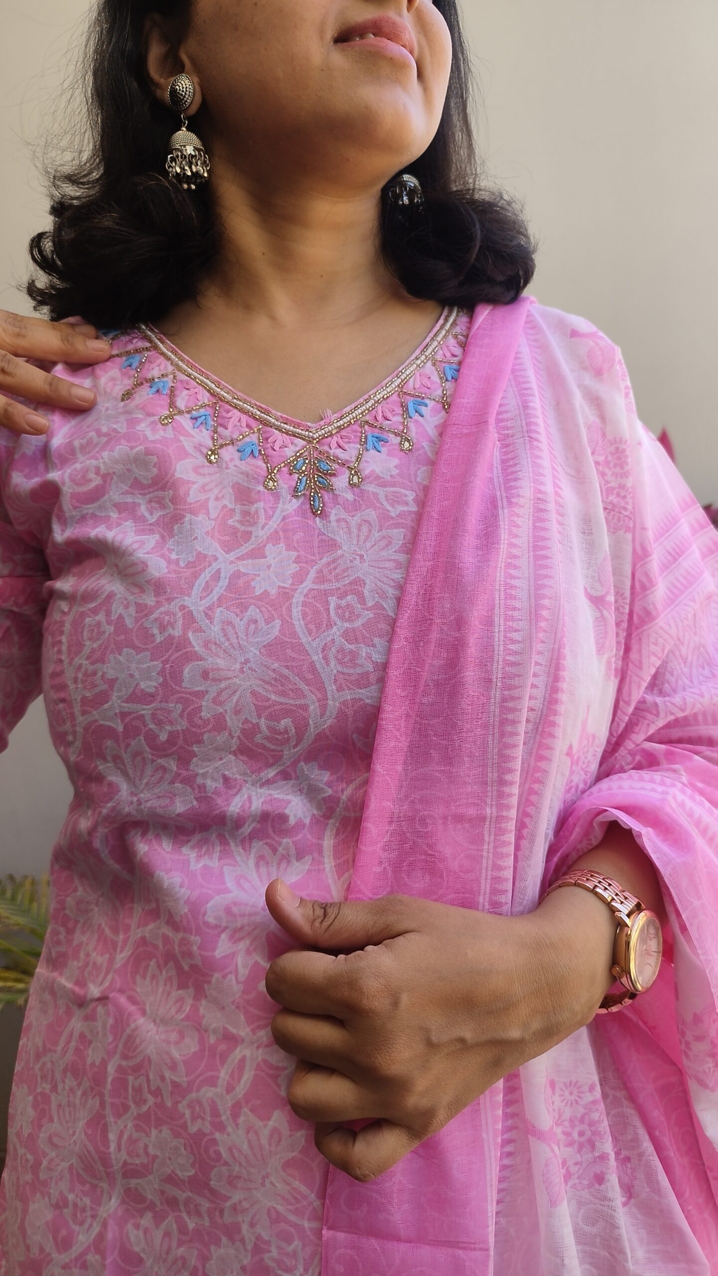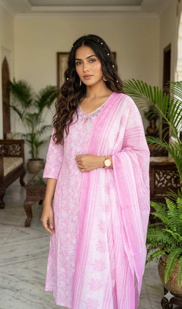 A beautiful combination made with 100% cotton fabric. It comes with dupatta and pants. It is perfect fit for regular wear or office wear . It has beautiful handwork on neck.