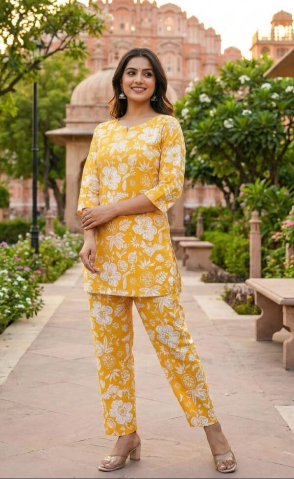 100% cotton Mustard Floral co-ordinate set is good to style outside, good for morning walk, yoga or just for comfortable night sleeps. Made using Mustard color with floral pattern . It is provided with pocket, long enough to keep mobile, wallet, earphones etc.