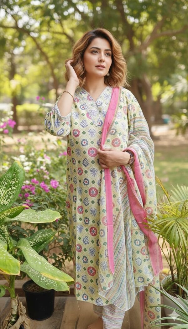 A beautiful combination made with 100% cotton fabric. It comes with dupatta and pants. It is perfect fit for regular wear or office wear .